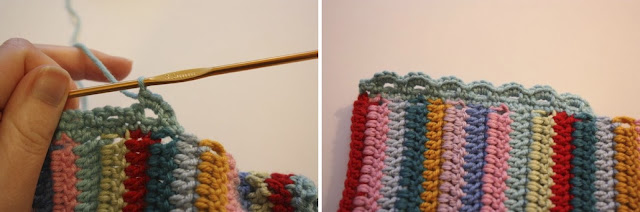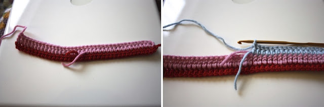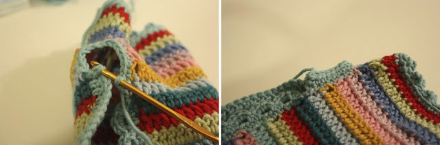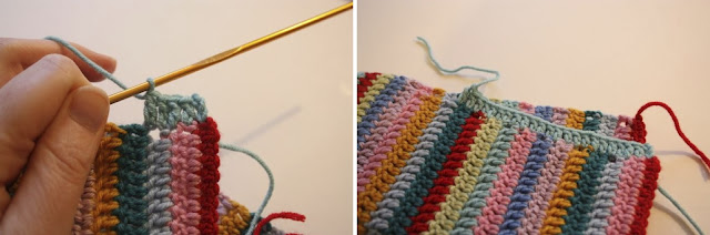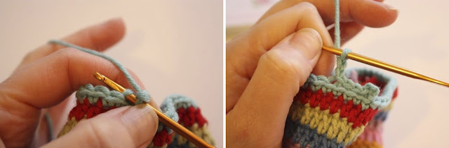 Chain 1 and make a dc into the same stitch, then work you way back down the stripes, making 2 dc's into the end of each tr stripe and just 1 dc into the last htr stripe. (Again, you should have 23 stitches in total.)