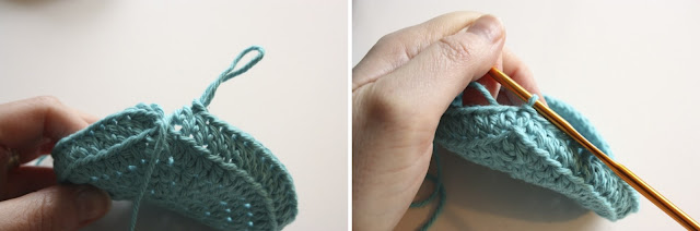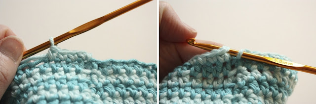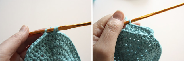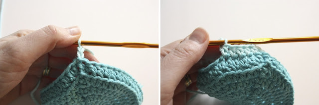 Now, for this round I worked into only the back loop of the stitches in the row below. You can see in the picture (above right) that I only have picked up one loop on my hook, and it's the loop that's furthest away from me, out of the two loops that make up the stitch.