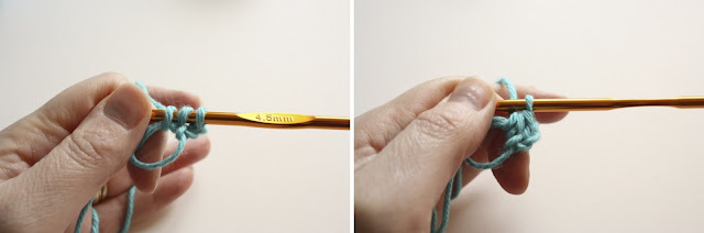 Yarn over and pull through the stitch, then yarn over and pull through the two loops on the hook, as you normally would to complete the stitch. (above left)