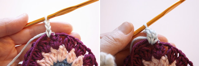 To finish the square, make a slip stitch into the top of the beginning chain of 3 (shown with my hook in the picture).
