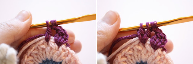 In the next chain space, we are going to make a double treble stitch, that's the one where you wrap the yarn twice around the hook before you insert the hook into the chain space. (Above left)