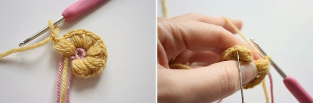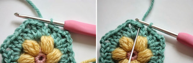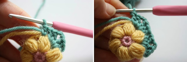 So after your last '4tr puff and 1 chain' is complete, we need to make a slip stitch into the top of the first puff stitch. See where the needle is pointing in the right hand picture above?