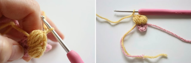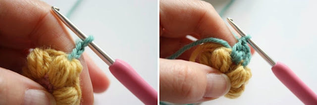 Attach a new colour yarn to the same puff stitch in your usual way.