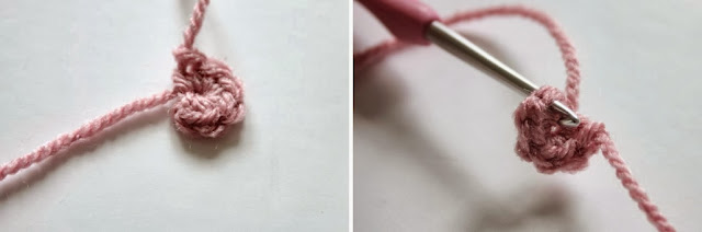 I like to start of these little puffs with a magic loop. If you're not too sure how to start one, see the beginning of my Mix and Match Flowers Tutorial.