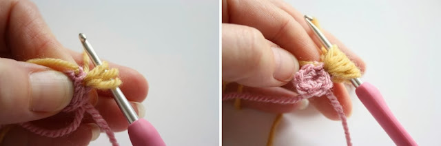 Pull the new colour up through the stitch a little more so that you have a big loop on your hook. You want to pull it up to roughly the same height as a treble stitch would be. Don't worry, it won't have to be exact. See on the right hand picture above, I have a huge, loose loop on my hook?