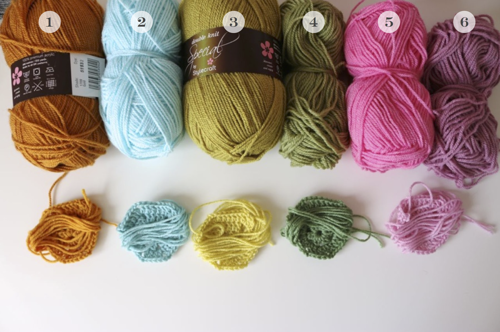 So, at the bottom are the hexies in the colours I'm using. At the top are balls of the nearest Stylecraft Special DK equivalents....