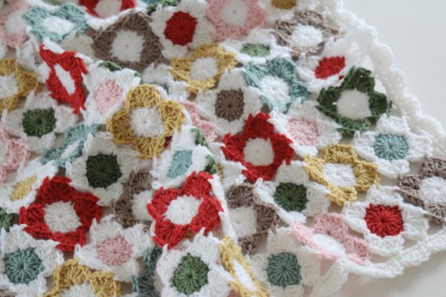 The part that caused the most agonising, was the border. I had an idea for a quite wide border, which was going to echo the petals and be very in keeping with the sixties theme. It was all quite lovely and thinking my test piece was perfect, I edged the whole blanket in it. But when it was done, lovely as it was, it just wasn't right. It was too overwhelming and so it had to go in favour of something simple and understated that allows those cute flowers that somehow manage to look geometric too, doing the talking instead. Much better.