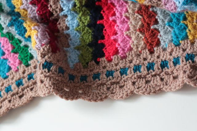 It looks a little like there's a teal ribbon woven through the brown edging of the border and I really like that. I'm slightly less convinced about the colours I've chosen though. At some point, quite early in the blanket, I decided that the brown would be the dominate border colour and then it never occurred to me to reassess that decision.... Oh well, a little late to agonise over it now I feel!