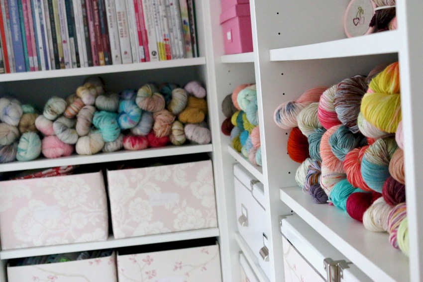 But, you can also get a matching set of shelves that are a little deeper, 40cm (16"), that's what the adjacent shelves are and they are deep enough for all sorts of boxes, books and just perfect for indy dyed yarn hanks!  I just swapped the 20cm deep fabric shelves for another set of 40cm deep shelves.  That's it.
