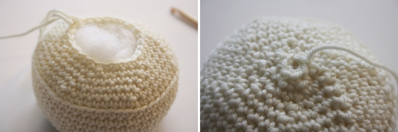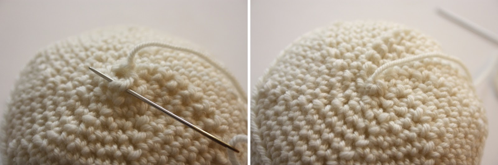Pull the thread up tightly to close the little hole and weave the yarn in a bit to secure it.