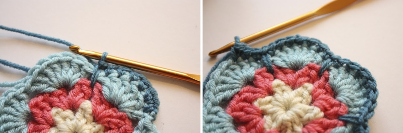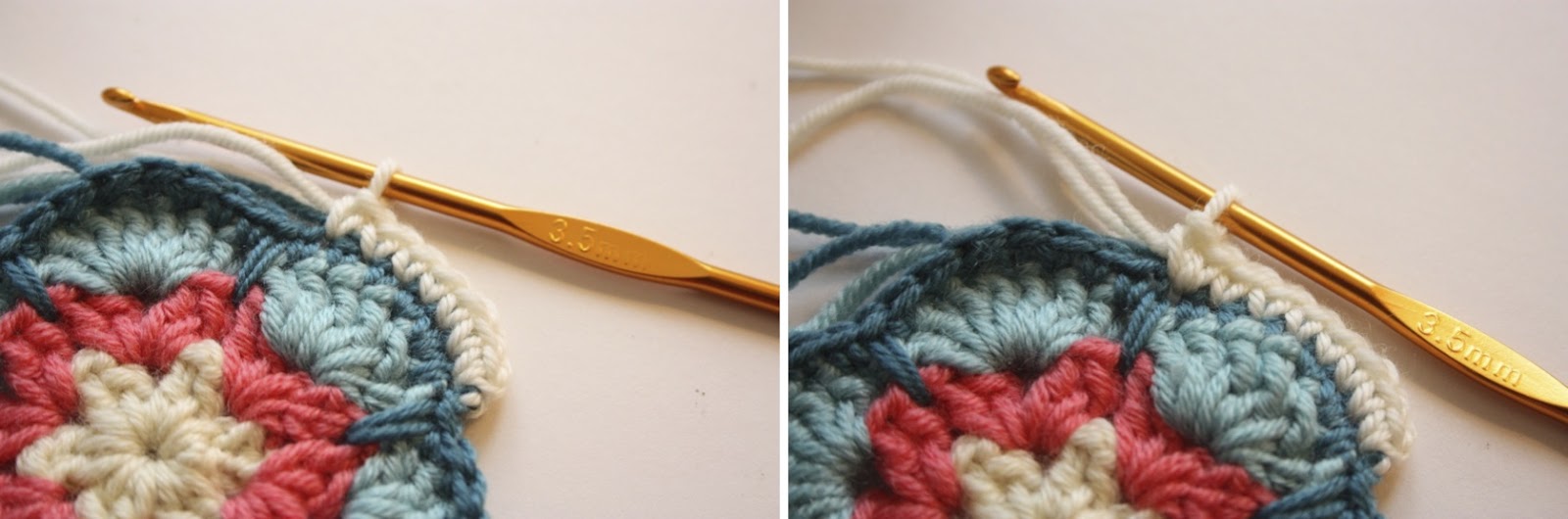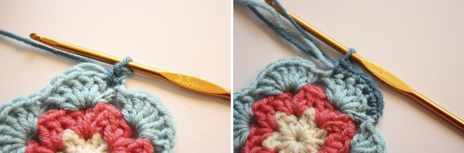 If you'd like to, break off the yarn and attach a new colour into a chain space at this point. (Some people prefer to keep the same colour for this round to make more of a petal shape.) Then chain 3.