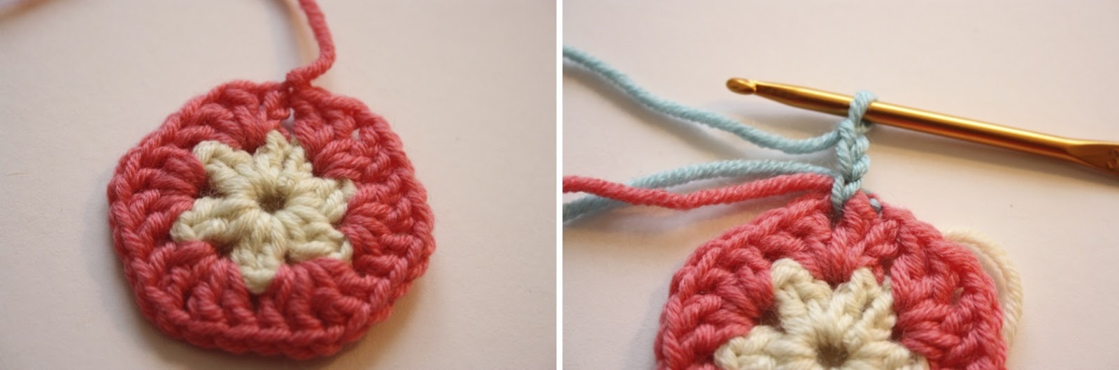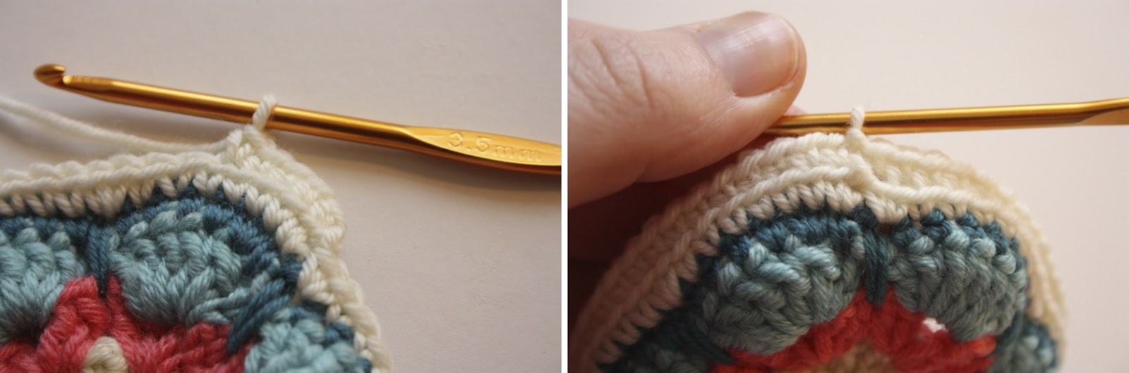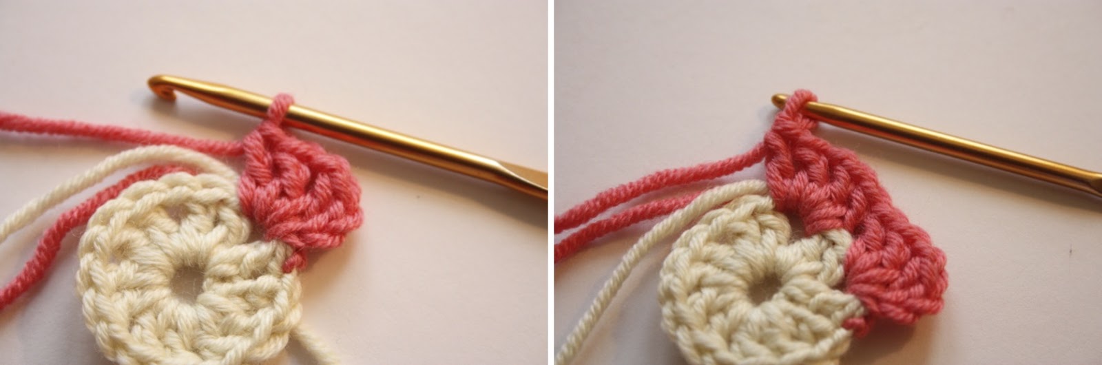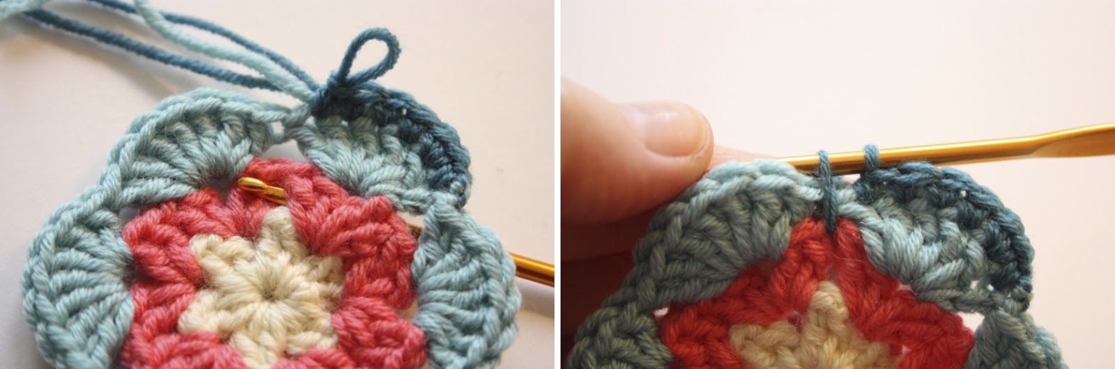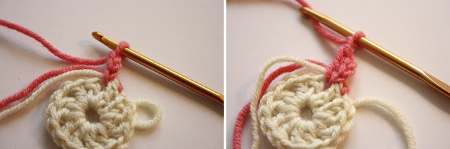 Cut the first colour yarn and attach the new colour into one of the chain spaces, then chain 3.
