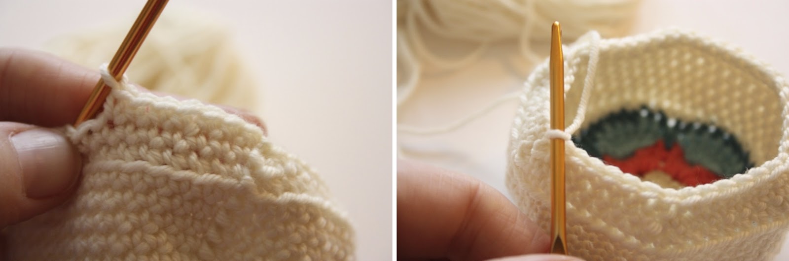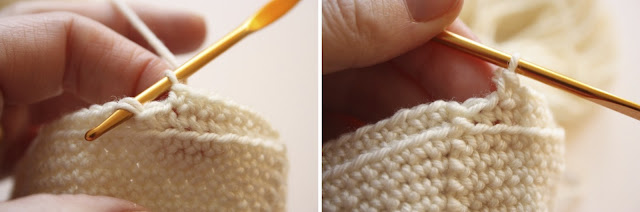 In order to make the sides of the pincushion, we're now going to make a round of dc stitches into the back loops only of the round before. Have a look closely at the picture above. See how my hook is only under one loop of the stitch, as not two as normal? You want your hook to be going under the back part of the stitch only, not the front part.